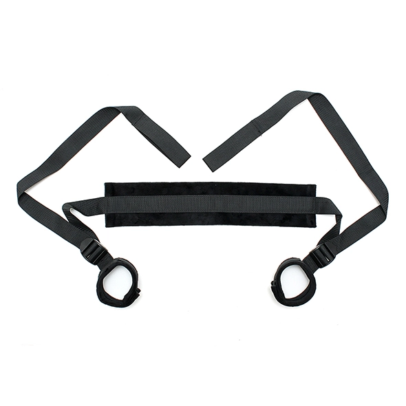 Zachte Fixatieband zwart met Voetboeien. Deze zachte bondage set heeft een grote zachte beschermingskussen in de nek en twee lange verstelbare banden verbonden aan zachte voetboeien. Houdt de benen omhoog in een spannende, maar onderdanig positie. De boeien hebben klittenbandsluiting. Deze positie of standjes versterker is ook verkrijgbaar in het zwart – paars