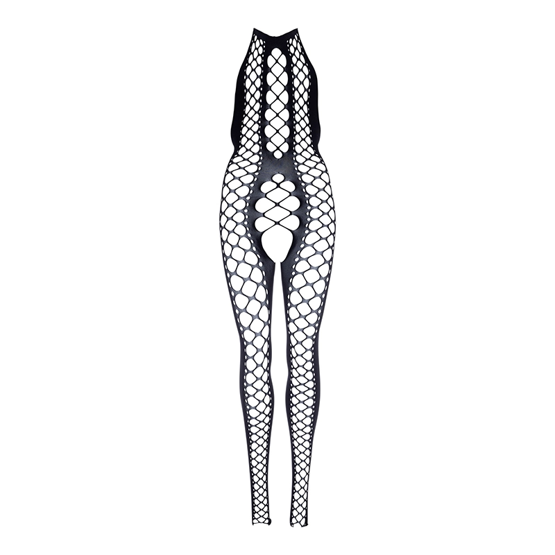 Open kruis halter bodystocking van een grove net met opaque. De bodystocking heeft een laag uitgesneden rug.