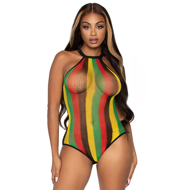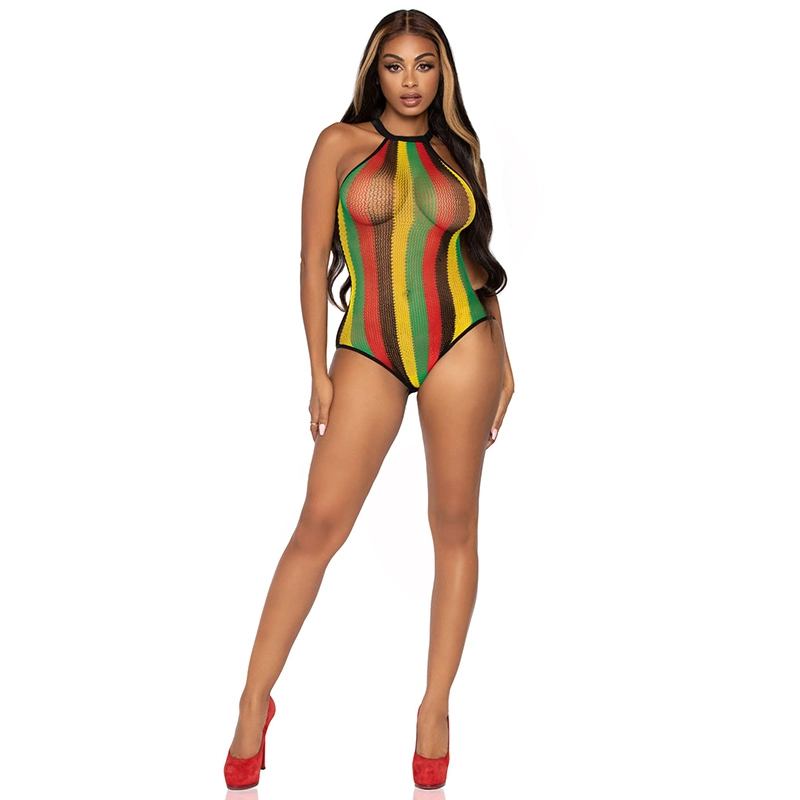 Rasta net bodysuit met racer back en drukknoop sluiting.