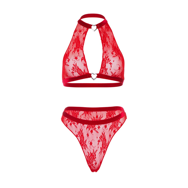 2-delige haltertop met fluwelen afwerking met hartsleutelgat en bijpassende string-slip met hoge taille.
