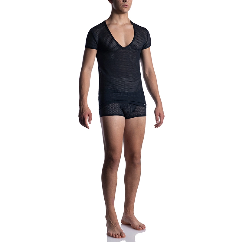 Sexy t-shirt gemaakt van lichtgewicht, doorschijnend mesh. Slank, flatterend model en diepe V-hals. Korte mouwen. Manstore-logo onderaan.