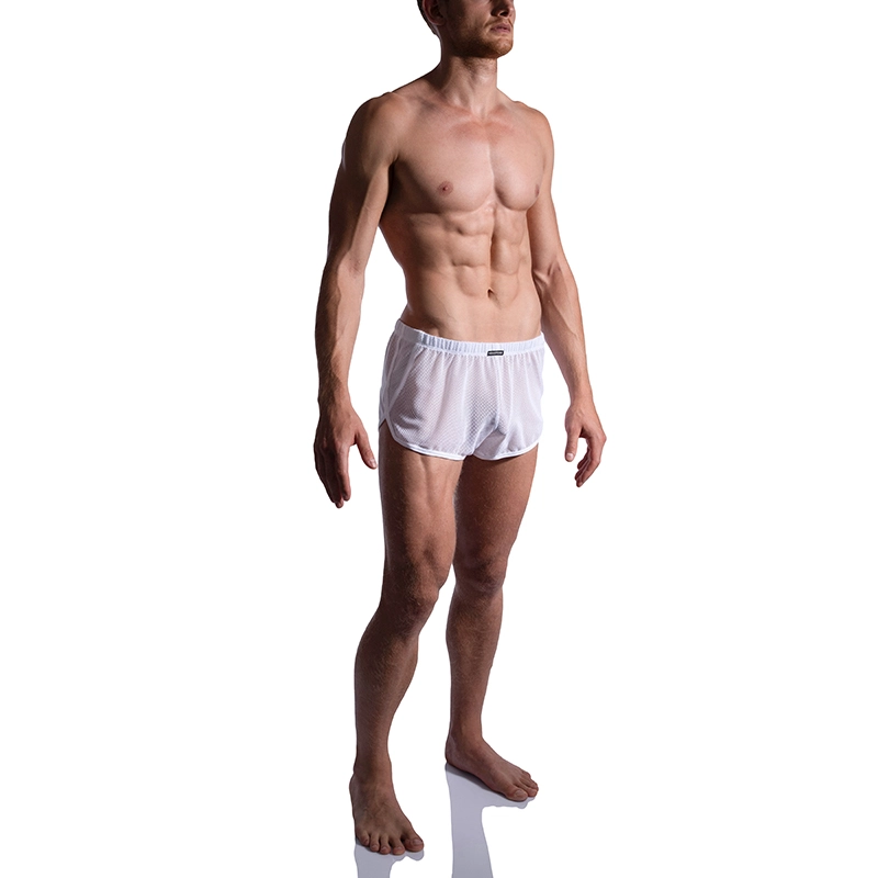 De sportieve MANSTORE M2181 Sprint Shorts in de kleuren wit en zwart transparant zijn verkrijgbaar in de maten S, M, L en XL .