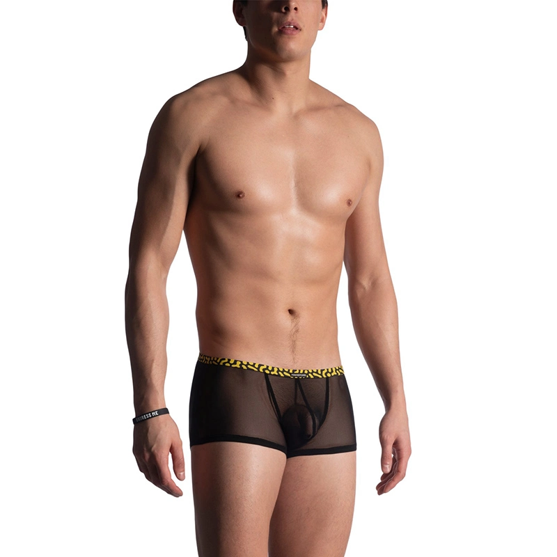 Deze Manstore boxer is gemaakt van een bijna transparante zwarte tule met een zwart-gele opdruk. Undress Me. Deze verleidelijke vraag is groot geschreven op de siliconen polsband die bij elk item in de M900-serie wordt mee geleverd.