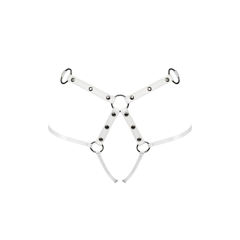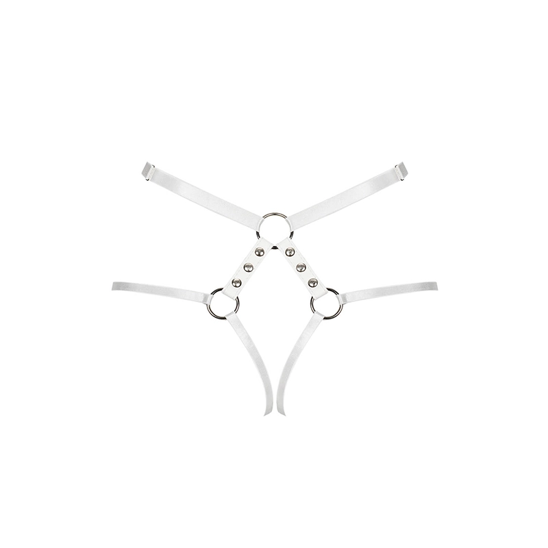 Uniek A758 Harnas wit van Obsessive met zilveren ringen en metalen nagels. Verstelbare bandjes in de taille zorgen voor een perfecte pasvorm. De duurzame, leerachtige bandjes creëren een geometrisch ontwerp en het kruis is open.
