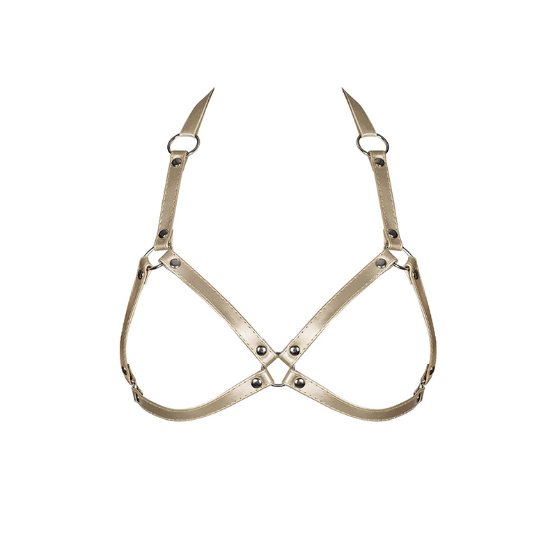 Luxe harnas A765 Harnas van goudkleurig kunstleer met verstelmogelijkheden en open cups. De bandjes zijn verbonden met metalen ringen, glanzende klinknagels zorgen voor een verleidelijk accent. Zacht en huidvriendelijk materiaal. De afgebeelde “A764 Jarretellegordel goud” is niet bij de levering inbegrepen en is apart verkrijgbaar.
