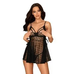 Fenomenale zwart jurkje met een sexy snit en een zachte en elastische materiaalcombinatie van uniek kant en transparant mesh materiaal met romantische hartjes. Met veters aan de zijkant, verstelbare bandjes en halve cups voor een perfecte pasvorm. Bijpassend koord inbegrepen.