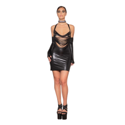 De Calicia wetlook jurk is een sexy en zeer vrouwelijke jurk ontworpen in zwarte wetlook. Kort en strak gesneden met een diep decolleté dat de borst onthult onder een lawine van bandjes. De rug wordt ook geaccentueerd met een opening tot aan de onderrug die eindigt in een V. De bandjes worden in de nek gestrikt voor een perfecte pasvorm.