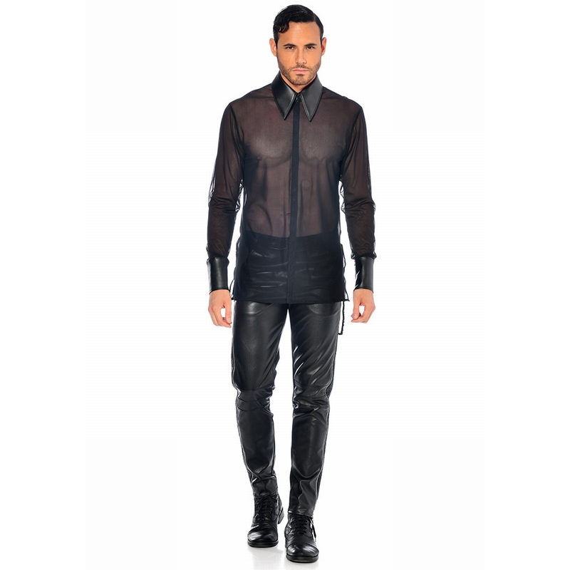 Jayden Shirt is een prachtig herenoverhemd in zwart transparant gaas van hoge kwaliteit. Zwarte kunstleer kraag, puntig gesneden. Onderkant van de mouwen van kunstleer met een zilveren rits. Het shirt heeft onzichtbare drukknopen over de gehele lengte. De snit is asymmetrisch aan de onderkant en langer aan de achterkant.