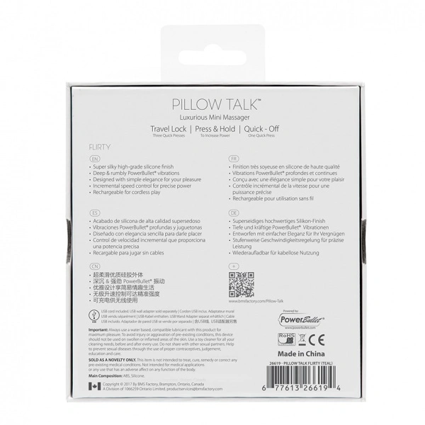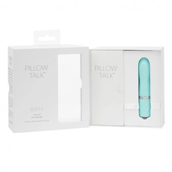 Pillow Talk is een collectie die schoonheid plezier en kracht uitdrukt en de Pillow Talk Flirty Mint is daarop geen uitzondering. Het zachte, flexibele ontwerp bevordert een speelse verkenning, terwijl het kleine formaat het perfect maakt om overal mee naar toe te nemen. Laat je niet voor de gek houden, Flirty zit boordevol kracht voor zelfs de meest ervaren power minnaar. Van het handvat met een gevoerde kussentextuur tot de oogverblindende Swarovski-kristallen knop, elke functie van Flirty is gemaakt met jou in gedachten. Met de oplaadbare batterij en het meegeleverde USB-laadsnoer is Pillow Talk altijd klaar voor gebruik.