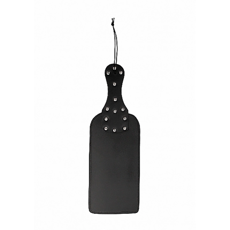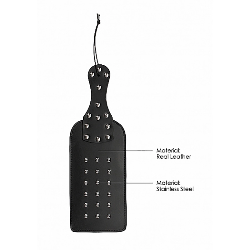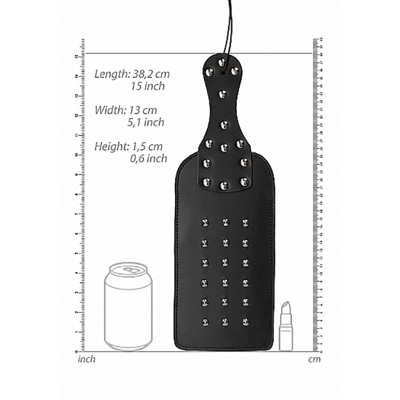 Deze Studded Paddle is gemaakt van zwaar zadelleder. Geef slag na slag met indrukwekkende impact en laat rooskleurige billen achter! Deze lederen peddel met studs levert een reeks van hoorbare klappen, tikken en klappen op en is perfect voor koppels die hun spankingessies naar een hoger niveau willen tillen! De Peddel met studs heeft een ergonomisch handvat en lederen polsbandje voor de perfecte grip bij elke klap. Een ontwerp van 18 studs bedekt de ene kant, terwijl de andere kant zacht en glad is. De peddel heeft een totale lengte van 38,1 cm (15″), een breedte van 13,5 cm (5,3″) en een stevig gewicht van 430 gram (15.2oz)
