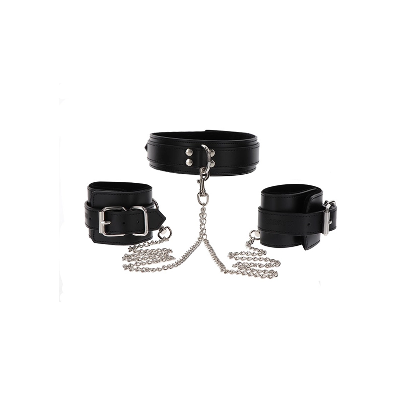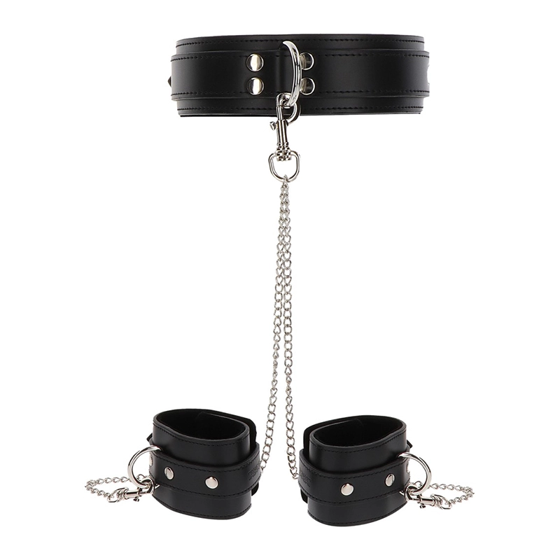 Draag de stijlvolle TABOOM Collar and Wrist Cuffs met trots. Deze stijlvolle halsband en handboeien kunnen worden gedragen als modeaccessoire of om te genieten van een goede BDSM-sessie. Doe de halsband om je nek en laat je leiden door je vertrouwde dominant. Deze set is perfect om al je fantasieën te ontdekken. Ervaar een hoger niveau van erotisch genot door de TABOOM Handboeien aan de D-ringen aan elke kant te verbinden. Maak je klaar voor een luxueuze bondage-ervaring met de hoogwaardige TABOOM D-ring halsband deluxe met handboeien.