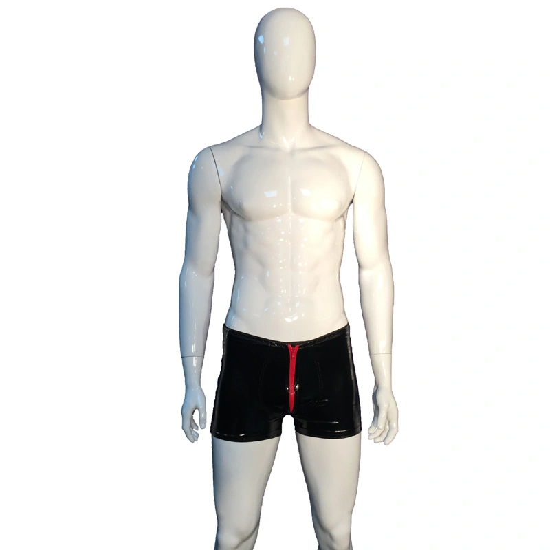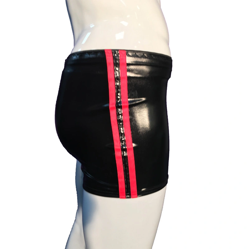 Korte broek in het zwart met twee rode streepjes aan de rechterkant. Gemaakt van een soepel stretch vinyl stof. Afsluitbaar met een rode kunststof rits en klittenband aan de binnenzijde van het broekje.Â