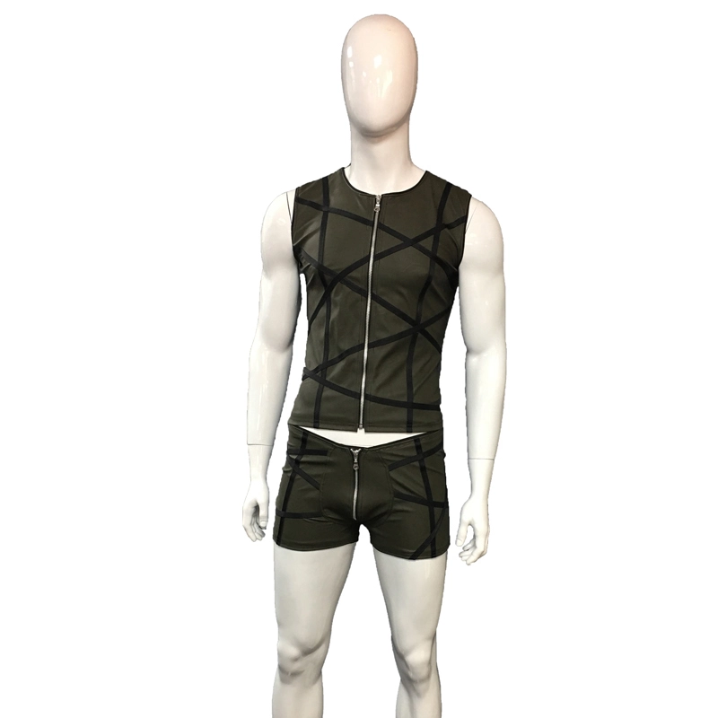 Stoere top gemaakt van een soepel groene stretch Kunstleren stof. Afsluitbaar met een rits. Met alleen aan de voorzijde zwarte bandjes. Mooi te combineren met de korte broek in de zelfde stijl waar mee het T-shirt op de foto is afgebeeld.