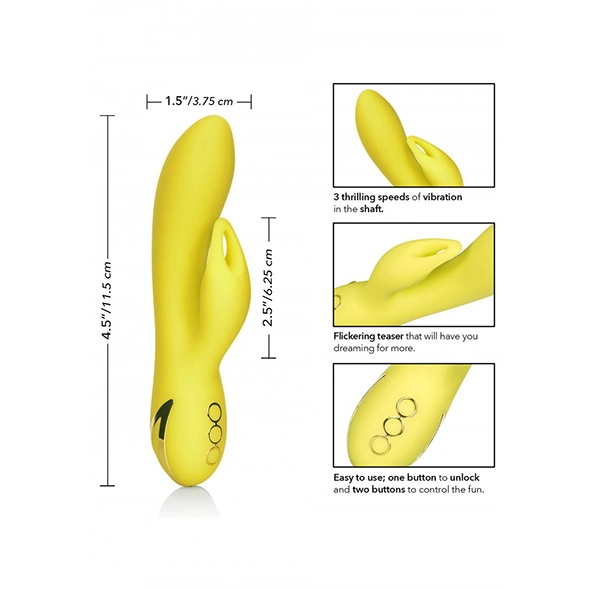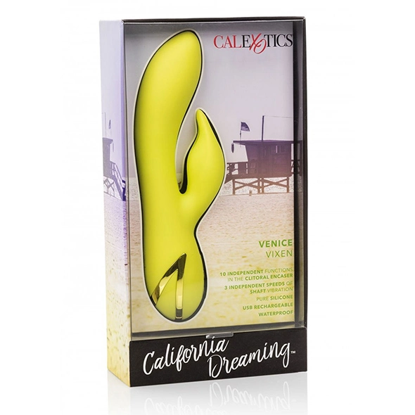 De Venice Vixen Vibrator van CalExotics is een rabbit vibrator die de G Spot, clitoris en de vagina stimuleert. Met zijn perfecte kromming geeft hij jou op 3 snelheden een onvergetelijke G spot verwenning. Met zijn Memory chip staat jou laatst gekozen functie in zijn geheugen. De volgende keer ga je dus gewoon vanuit die positie verder. Ook zorgt zijn 10 delige vibratieprogramma voor een verwenning op maat. Met deze oplaadbare, waterbestendige en natuurlijk bodysafe vibrator zijn ongekende hoogtepunten binnen handbereik.