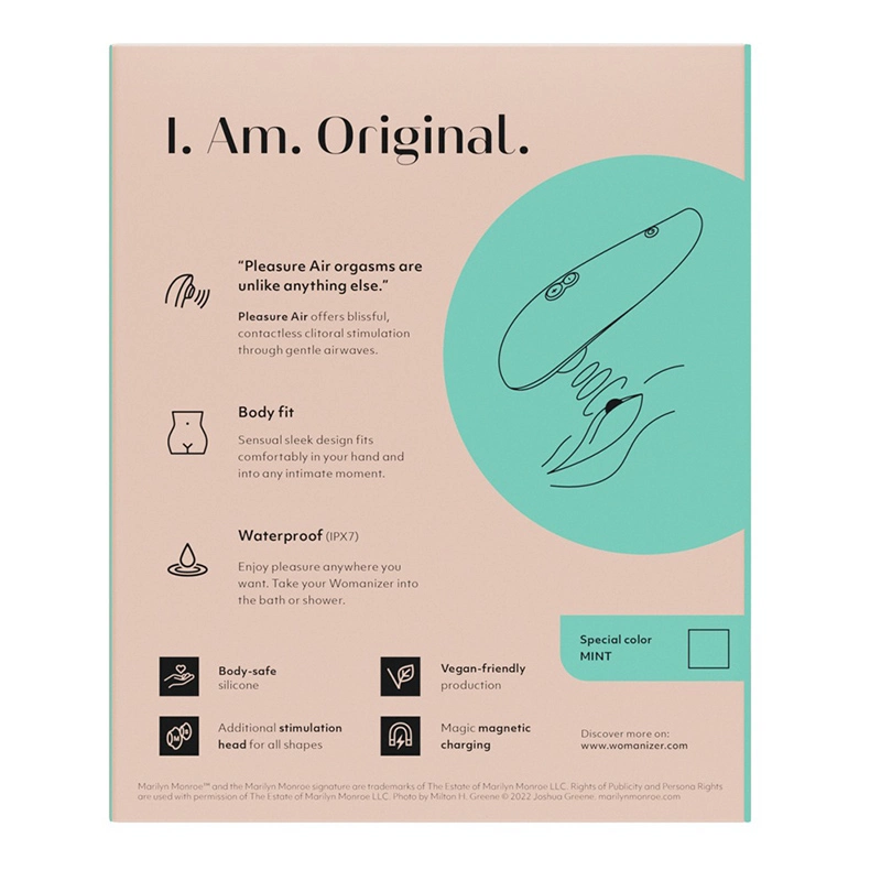 De Womanizer Marilyn Monroe Special Edition Mint is een krachtige, maar fluisterstille drukgolfstimulator en verwent met 10 verschillende intensiteiten die met een druk op de knop (+/-) gemakkelijk omhoog en omlaag kunnen worden geregeld. De gepatenteerde Pleasure Air Technology stimuleert de clitoris precies zonder deze aan te raken, zelfs in bad en onder de douche, want hij is waterproof. Om het orgasme ontspannen af te sluiten, schakelt de Womanizer met één druk op de knop direct terug naar het laagste niveau (nagloeien).