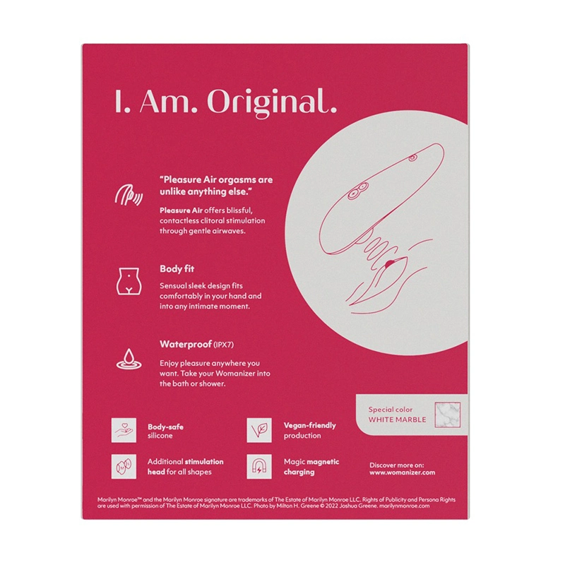 De Womanizer Marilyn Monroe Special Edition Wit is een krachtige, maar fluisterstille drukgolfstimulator en verwent met 10 verschillende intensiteiten die met een druk op de knop (+/-) gemakkelijk omhoog en omlaag kunnen worden geregeld. De gepatenteerde Pleasure Air Technology stimuleert de clitoris precies zonder deze aan te raken, zelfs in bad en onder de douche, want hij is waterproof. Om het orgasme ontspannen af te sluiten, schakelt de Womanizer met één druk op de knop direct terug naar het laagste niveau (nagloeien).